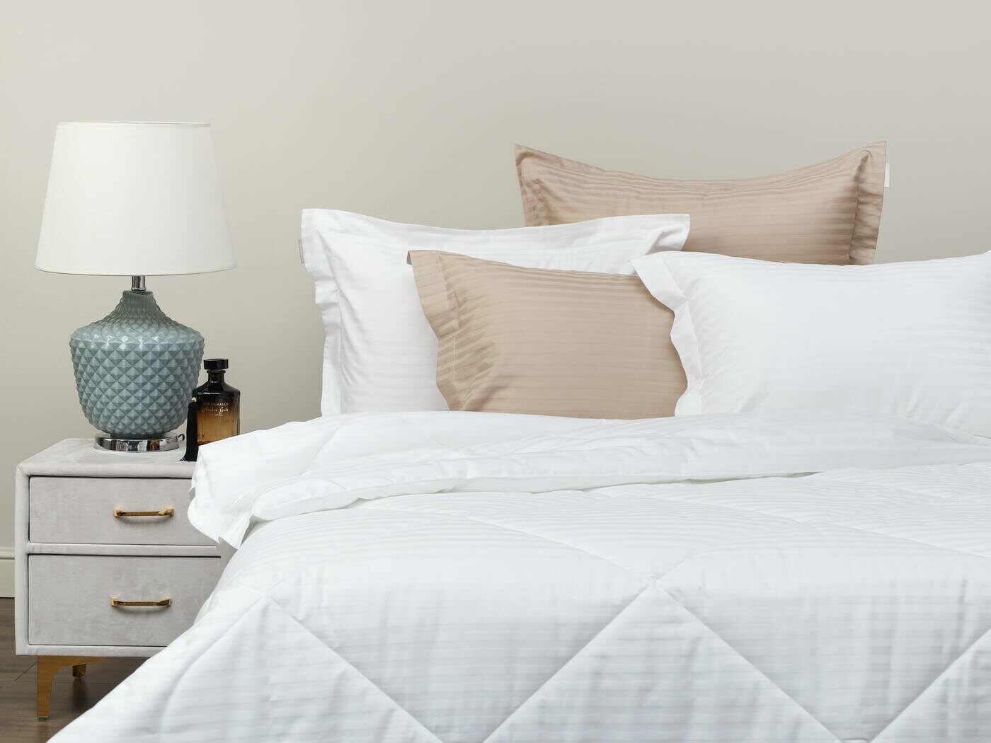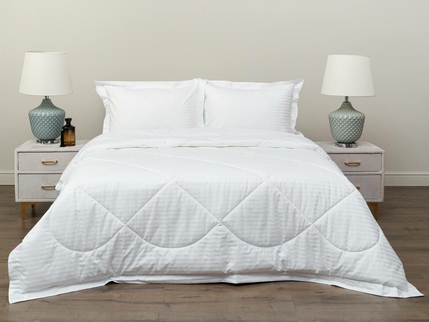 Одеяло очень удобно в использовании, легко стирается и быстро сохнет. Оно универсальное, средней толщины, что позволяет использовать его круглый год. К тому же, оно простегано элегантной стежкой, что не только придает красоты нашим комплектам, но и отлично фиксирует слой наполнителя внутри изделия.