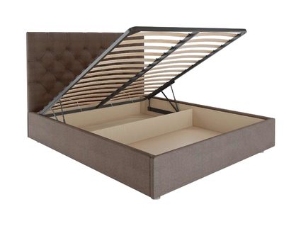 Основание кровати имеет встроенный подъёмный механизм. Система открывает удобный доступ к бельевому ящику. Таким образом организуется удобная система хранения, где можно складывать постельные бельё и сезонные вещи.
