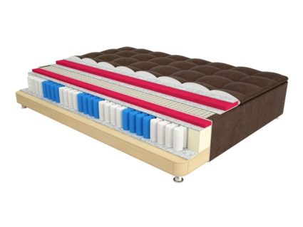 Очень стильный, высокий кроватный бокс, единственный самодостаточный, который не обязывает вас к покупке матраса. Универсальность данного бокса достигается за счет встроенных пружин в основании высотой 14 сантиметров и верхнего настила натуральной испанской соевой пены. Это значительно усиливает ортопедический и анатомический эффекты матраса. Но самым главным преимуществом топ бокса является топпер из двух сантиметров натуральной соевой пены. Благодаря такому сложному и практичному основанию бокс можно использовать без матраса.