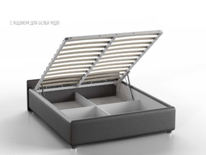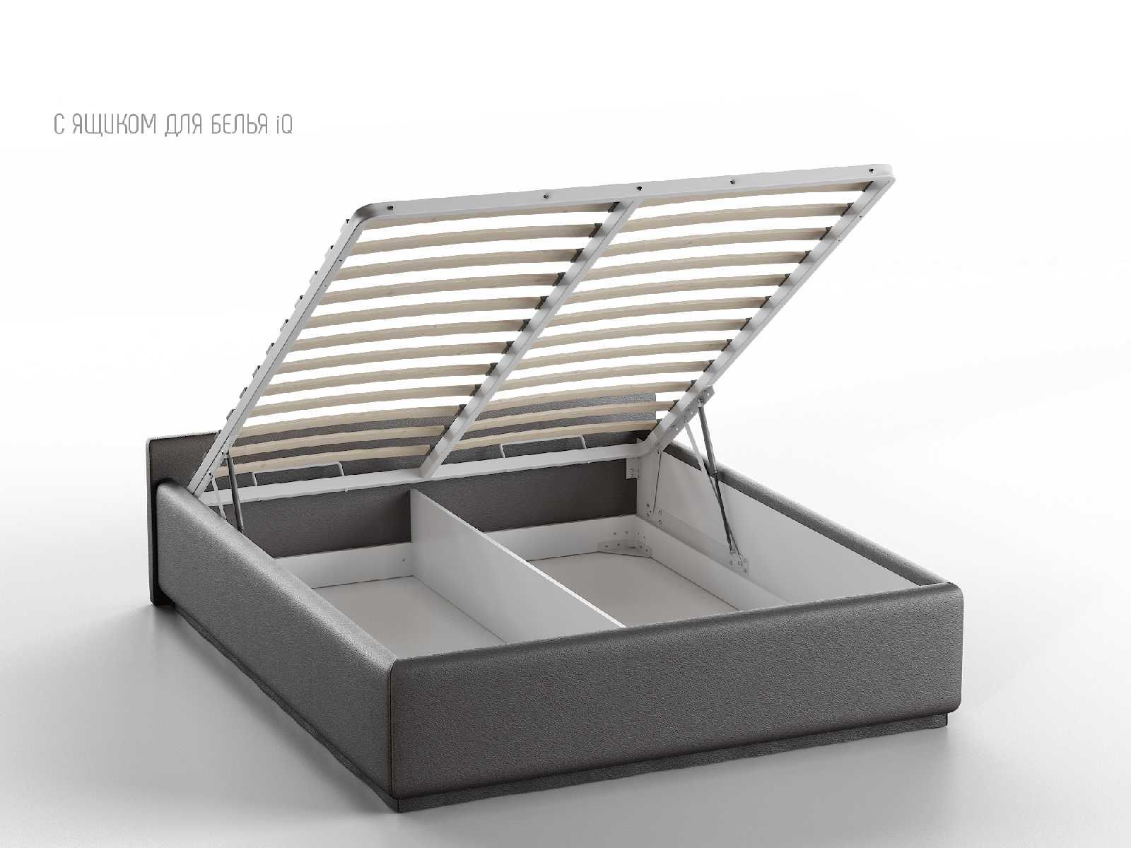 Кровать укомплектована IQ с подъемным механизмом и ящиком для белья без дна (дополнительная платная опция - дно к ящику IQ из HDF (ХДФ). Каркас кровати на цоколе, декоративный чехол на цоколе съёмный. Глубина ящика для белья - 30 см, без ограничения нагрузки на ящик.