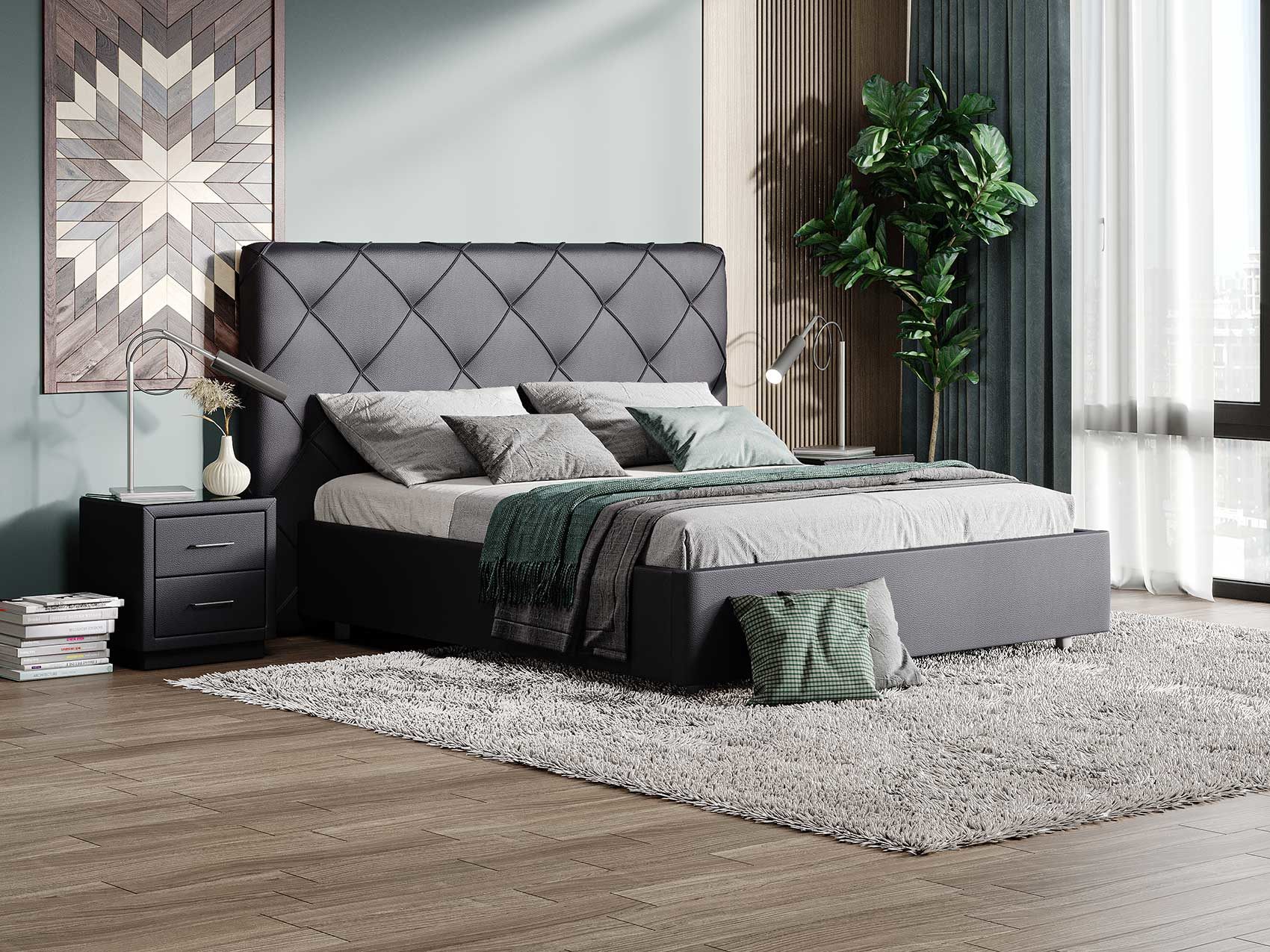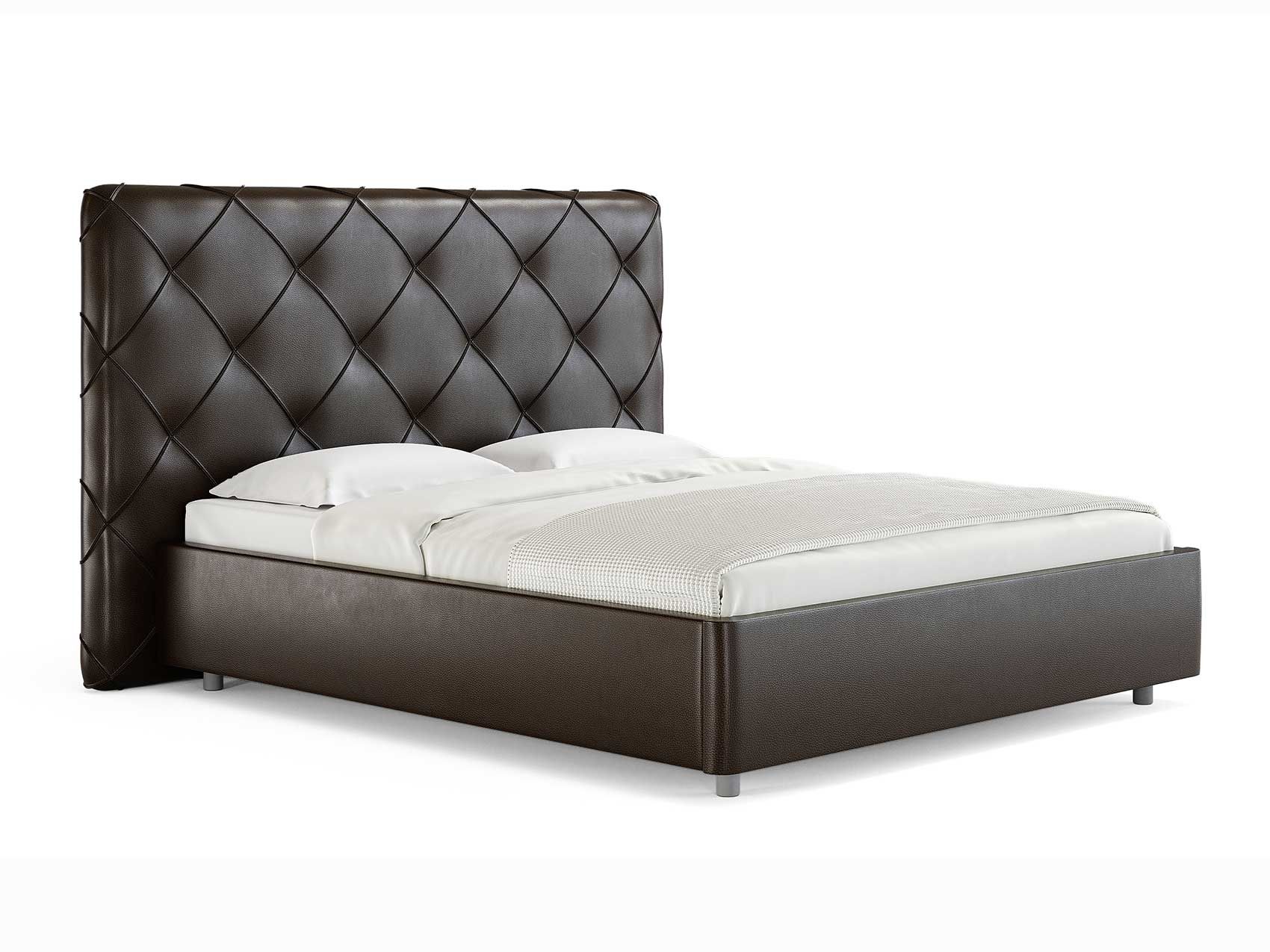 Современная интерьерная кровать. Ножная царга кровати скругленная по углам, что обеспечивает более элегантный внешний вид.