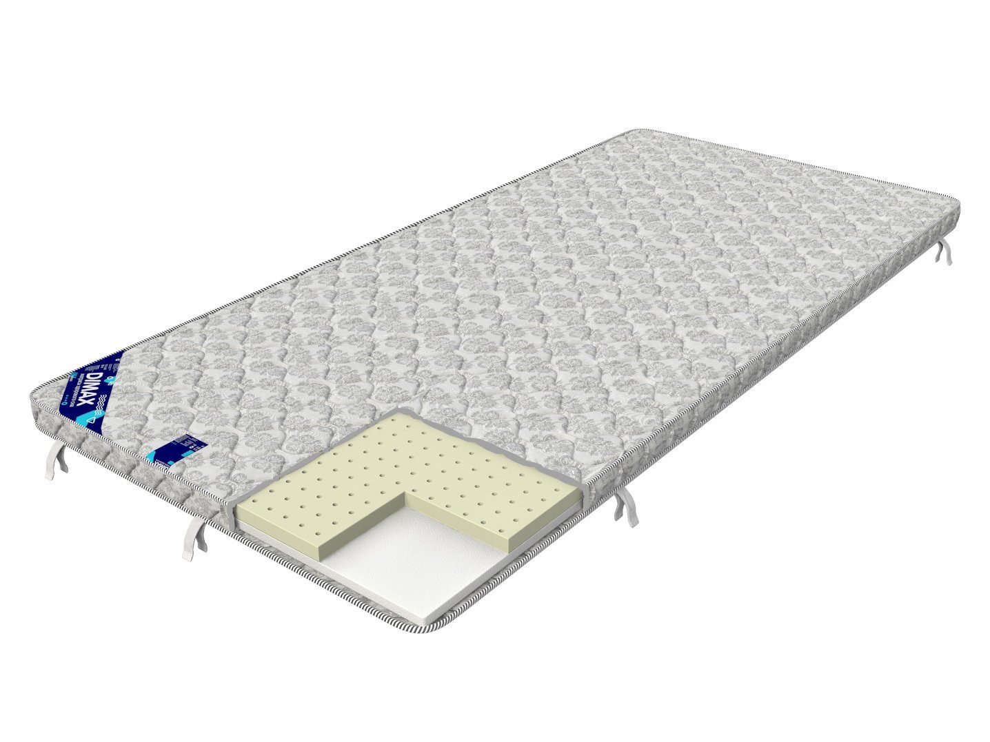 На модель надет жаккардовый чехол, простёганный на синтепоне. Ткань украшена приятным неярким принтом. По бокам изделия предусмотрены липучки для крепления матраса к спальной поверхности. По желанию клиента можно их не вшивать.