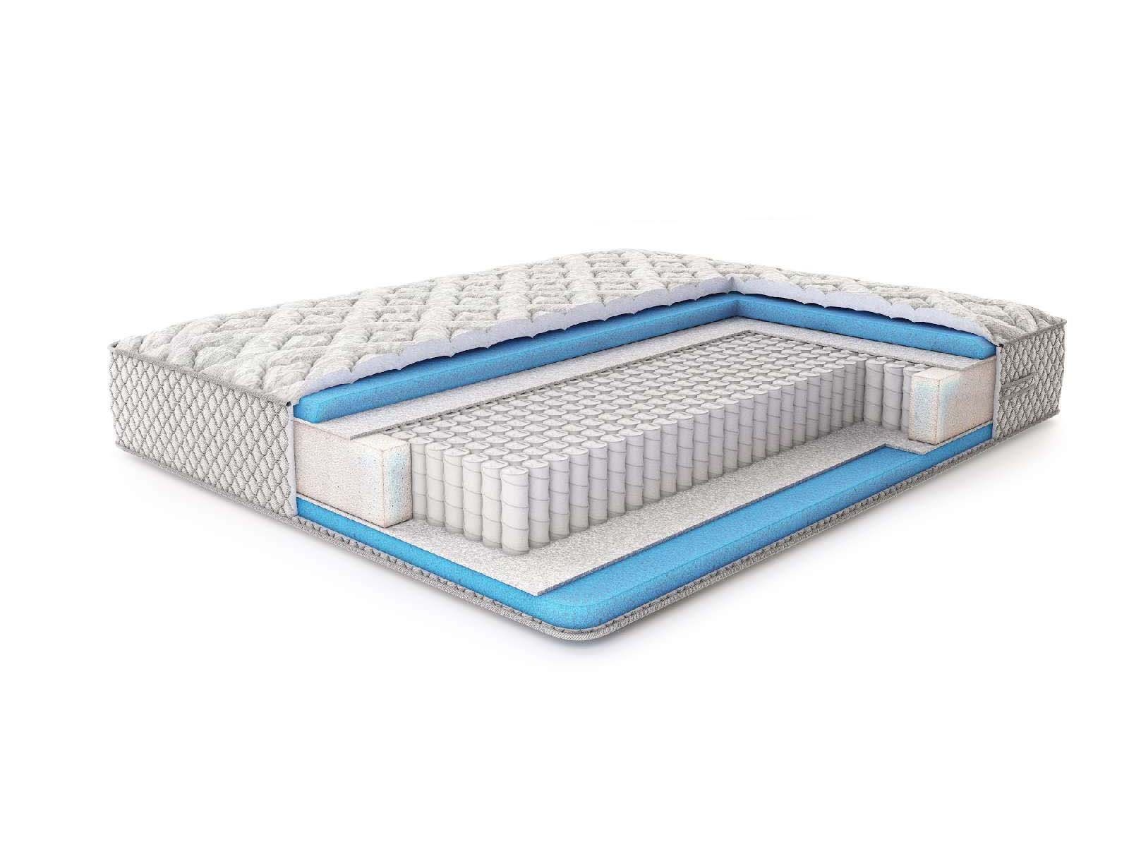 Пласты матраса сшиты из жаккард. Ткань простёгивается на слоях холлкона 300 гр., ППУ 1 см и спанбонде, что позволяет усилить комфортные качества. Бурлет модели оформляется при помощи жаккарда серого оттенка, простроченного на ППУ.