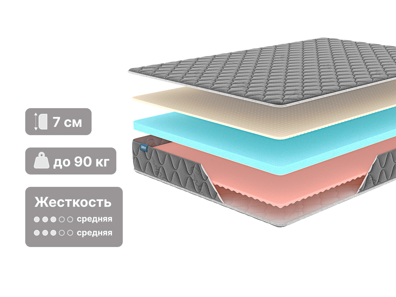 Матрас беспружинный, а значит внутри модели установлены только наполнители. Отсутствие пружин и подвижных частей делает изделие более прочным и долговечным.
