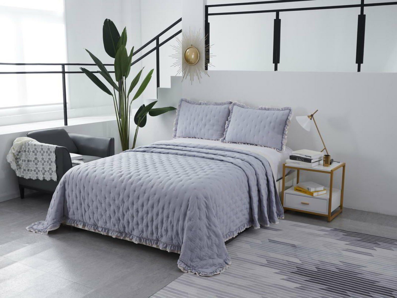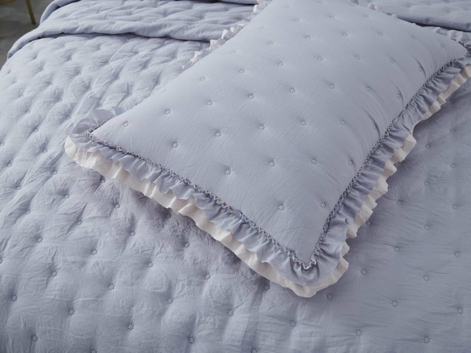 Покрывала выполнены в десяти оттенках, они подойдут для различных интерьеров, объединяет коллекцию потрясающее качество и приятный внешний вид. Изделия декорированы рюшами по краю, что подчеркивает из красоту и изысканность.